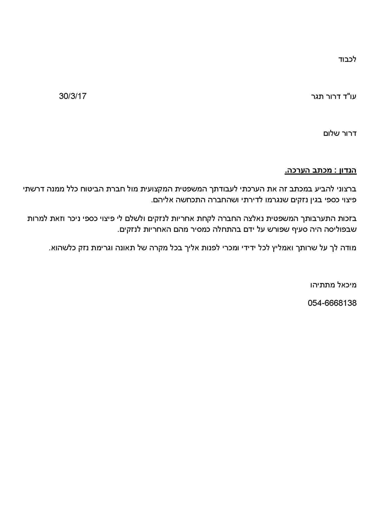לעורך דין דרור תגר, העומד בראש המשרד, ניסיון רב ומוצלח בניהול תביעות נזיקיות בקשת רחבה של תחומים, לרבות בתחום תאונות הדרכים, תאונות עבודה ורשלנות רפואית. עורך דין תגר חרט על דגלו להעניק ללקוחותיו שירות משפטי ברמה הגבוהה ביותר, השם את הלקוח בעמדה בה הוא בקיא בתיק, ומקבל עדכון שוטף וברור לגבי מצבו המשפטי לפי ההתפתחות בתיק.